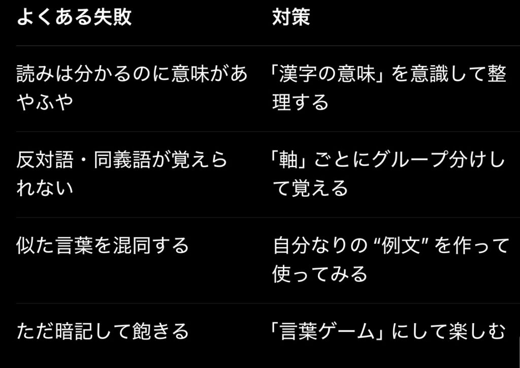 同音異義語は「漢字の意味」を意識して区別しよう 反対語は「何の軸で反対か」を考えると覚えやすい 同義語は「言葉探しゲーム」感覚で楽しく増やそう 例文を作ったり使ってみたりすると記憶が定着する!