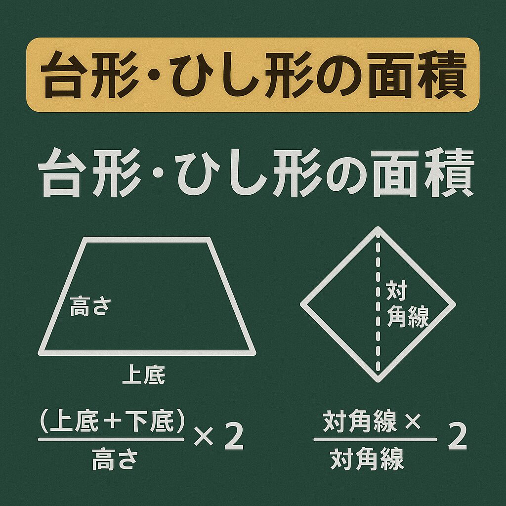 台形の面積=(上底+下底)×高さ÷2 ひし形の面積=対角線×対角線÷2 ポイント:高さは垂直に、÷2を忘れない 生活での活用:屋根、旗、花壇、タイルなど