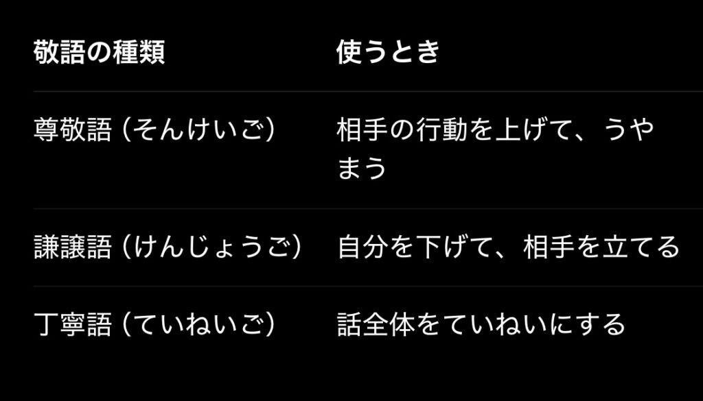 尊敬語は「相手の動作」に使う 謙譲語は「自分の動作」に使う 丁寧語は「文の終わり」をていねいにする(「〜です」「〜ます」など)